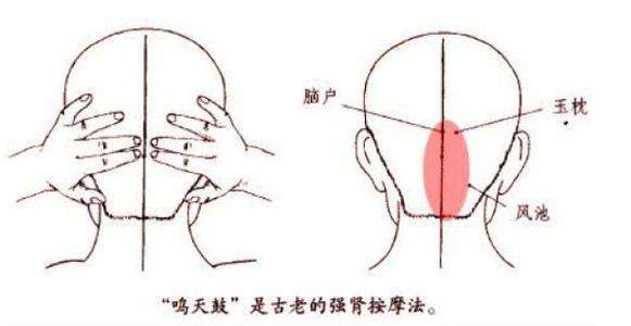 “鸣天鼓”是我国流传已久的一种自我按摩保健方法,意即击探天鼓(指敲玉枕穴)。该法最早见于邱处机的《颐身集》,原书这样描述“两手掩耳,即以第二指压中指上,用第二指弹脑后两骨做响声,谓之鸣天鼓(可去风池邪气)”。